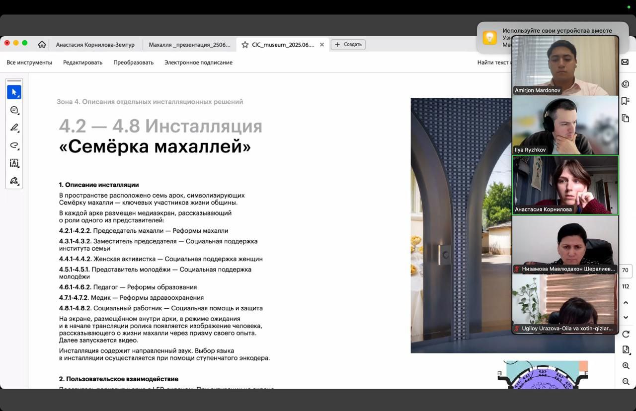 Onlayn uchrashuvda sahna vizualizatsiyasi, zamonaviy materiallaridan foydalanish, 3D animatsiyalar orqali zamondosh mashhur shaxslarning qiyofalarini jonlantirish, boʻlimga yangi va zamonaviy texnologiyalarni joriy qilish masalalari muhokama qilindi.