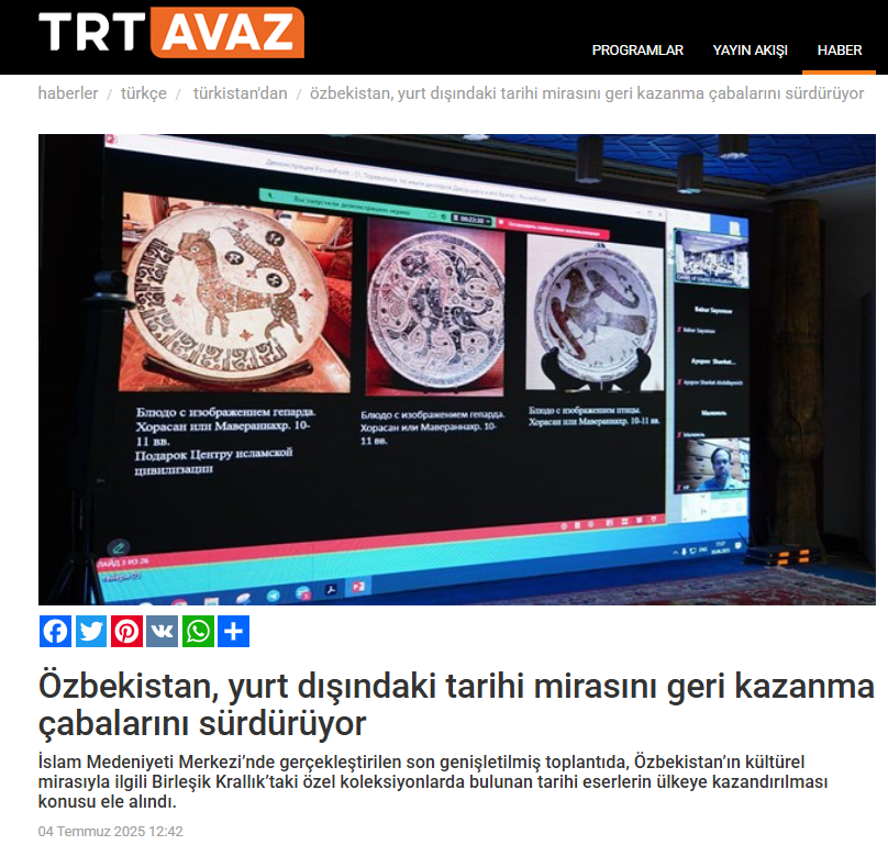 Turkiy tilli mamlakatlarga moʻljallangan Turkiyaning nufuzli TRT AVAZ telekanali saytida Oʻzbekistondagi Islom sivilizatsiyasi markazida amalga oshirilayotgan ishlar, xususan dunyo muzeylari va xususiy kolleksiyalarda saqlanayotgan tarixiy meroslarini yurtga qaytarish yoʻlidagi saʼy-harakatlariga oid xabar eʼlon qilindi. TRT AVAZ ga koʻra, London va boshqa Yevropa shaharlaridagi taniqli sanʼat kolleksiyalarida Somoniylar, Qoraxoniylar, Xorazmshohlar, Temuriylar va Oʻzbek xonliklari davriga oid yuksak tarixiy va madaniy qiymatga ega ashyolar saqlanmoqda.