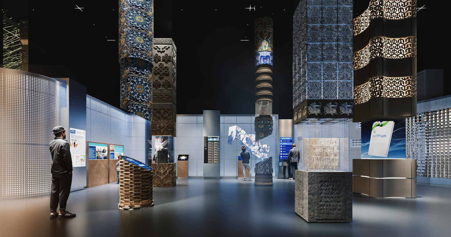 “Har bir ustun oʻz davrining meʼmorchiligi, madaniy muhiti, sivilizatsiyasi va kashfiyotlarini ifodalaydi. Ularning ichki boʻshliqlarida esa Oʻzbekiston davlatchiligining besh muhim bosqichiga oid asosiy siyosiy, ijtimoiy va madaniy manbalar namoyish etiladi — qoʻlyozmalar, faksimilelar yoki mulyajlar shaklida. Ushbu ekspozitsiya oʻzbek davlatchiligining uzluksiz tarixiy merosini, qadimgi yozma manbalardan to zamonaviy konstitutsiyaviy tamoyillargacha boʻlgan evolyutsion jarayonini jonli tarzda koʻrsatadi” — dedi markaz ilmiy kotibi Rustam Jabborov.