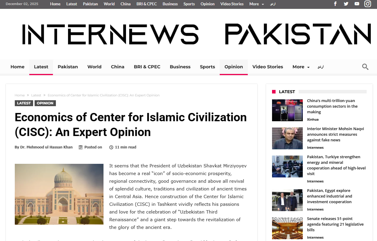 Pokistonning “Internews Pakistan” nashrida Oʻzbekistondagi Islom sivilizatsiyasi markazi haqida maqola eʼlon qilindi. Maqolada markazning madaniy, ilmiy va taʼlimiy ahamiyati, uning zamonaviy texnologiyalar va tarixiy merosni uygʻunlashtirishdagi roli hamda Oʻzbekistonning global madaniy va iqtisodiy maydondagi nufuzini oshirishdagi hissasi keng yoritildi.