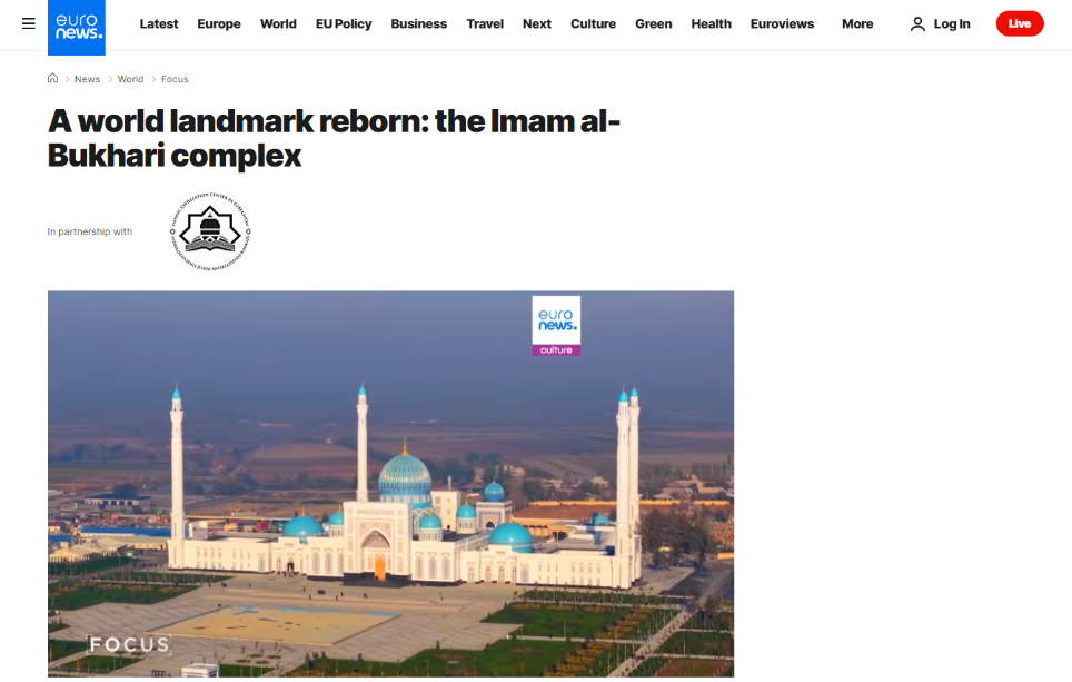 Euronews nashri Oʻzbekistonda musulmon olamining eng muqaddas ziyorat maskanlaridan biri hisoblangan Imom al-Buxoriy yodgorlik majmuasining keng koʻlamli qayta tiklanishini yoritdi. Materialda Samarqand yaqinida joylashgan ushbu ziyoratgohning asrlar davomidagi tarixiy ahamiyati, buyuk muhaddis Imom al-Buxoriy merosiga boʻlgan ehtirom, shuningdek, anʼanaviy meʼmorchilikni zamonaviy infratuzilma bilan uygʻunlashtirgan holda yaratilgan yangi majmua dunyo miqyosidagi ziyorat va maʼnaviy maskan sifatida taqdim etilgan.