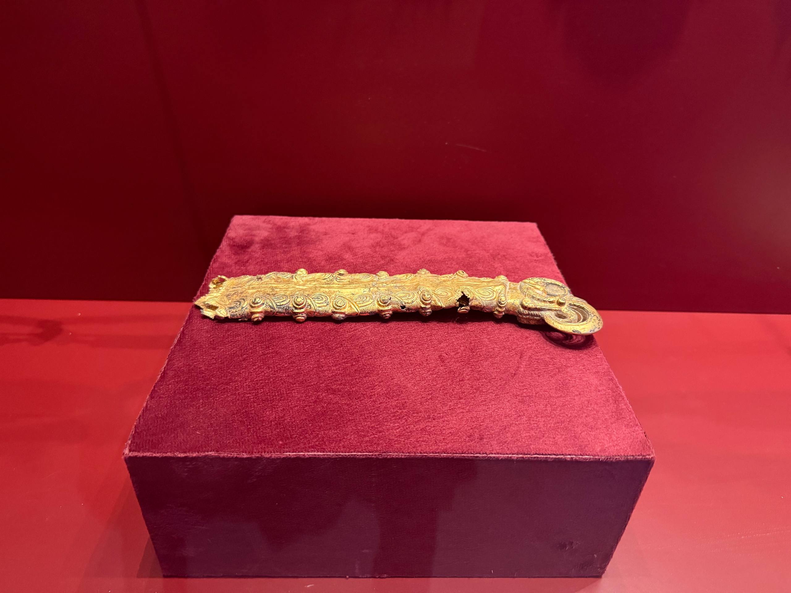 Экспозициядаги энг ноёб экспонатлардан бири милоддан аввалги IV асрга оид олтин пичоқ қинидир. У Аҳамонийлар даври ва Искандар Македонский юришлари билан боғлиқ тарихий жараёнларни акс эттиради. Қин юзасидаги ҳайвонлар ва афсонавий образлар сак, суғд ва бақтрия санъати анъаналарининг ўзаро уйғунлигини намоён этади.