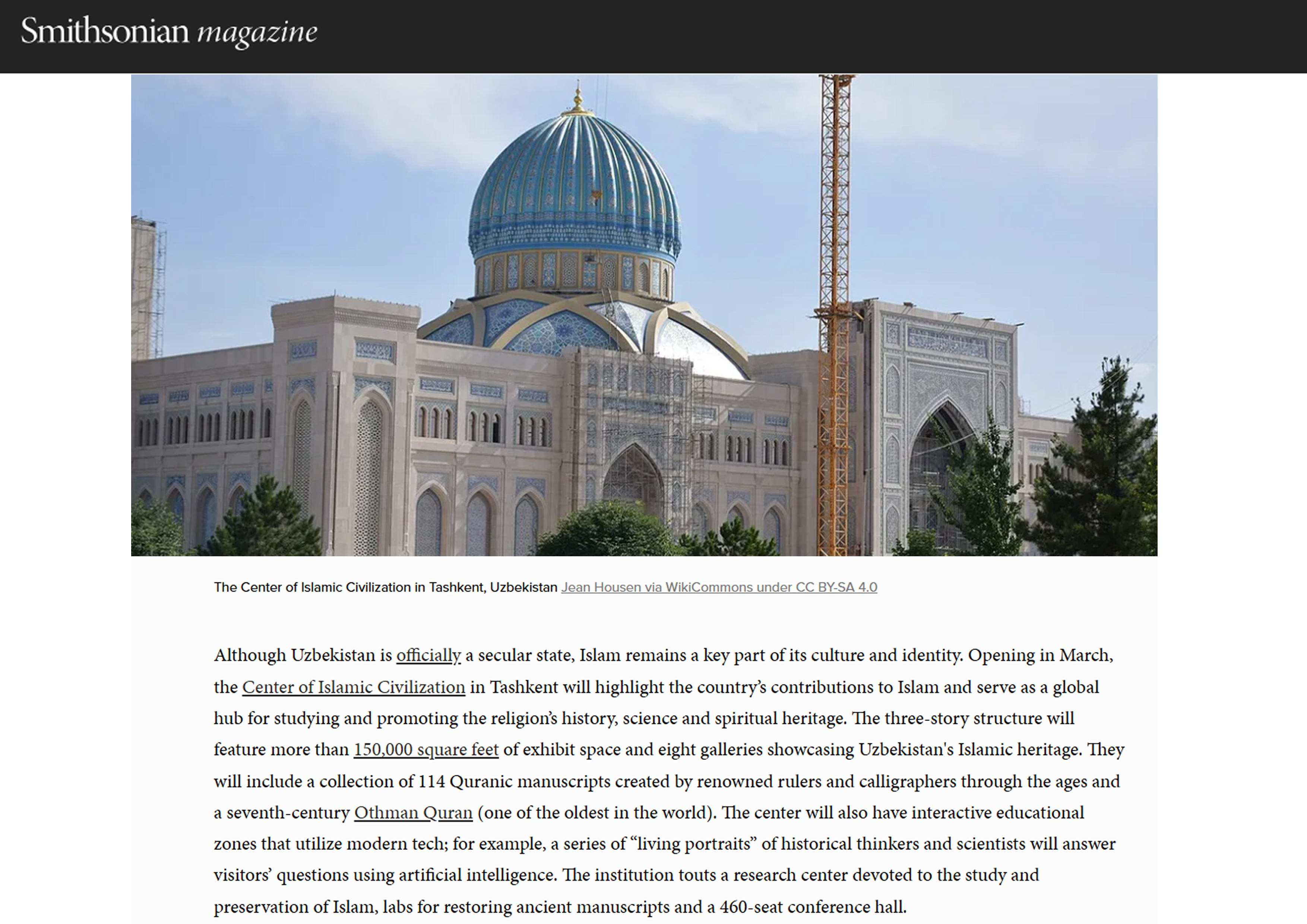 Тошкентда барпо этилаётган Ўзбекистондаги Ислом цивилизацияси маркази Smithsonian Magazine — АҚШдаги Смитсон институтининг расмий нашри талқинига кўра, 2026 йилда дунёда энг катта қизиқиш билан кутилган 10 та музейдан бири сифатида эътироф этилди. 1970 йилда ташкил этилган ушбу журнал фан, тарих, маданият ва музейшунослик соҳаларида халқаро миқёсда нуфузли илмий-оммабоп нашр ҳисобланади. Унинг рейтингларига киритилиш лойиҳалар учун жаҳон даражасидаги юксак эксперт баҳосининг белгиси сифатида қаралади.