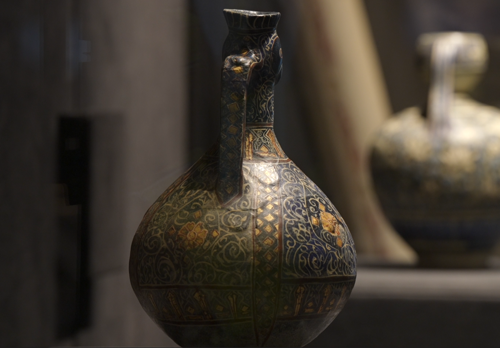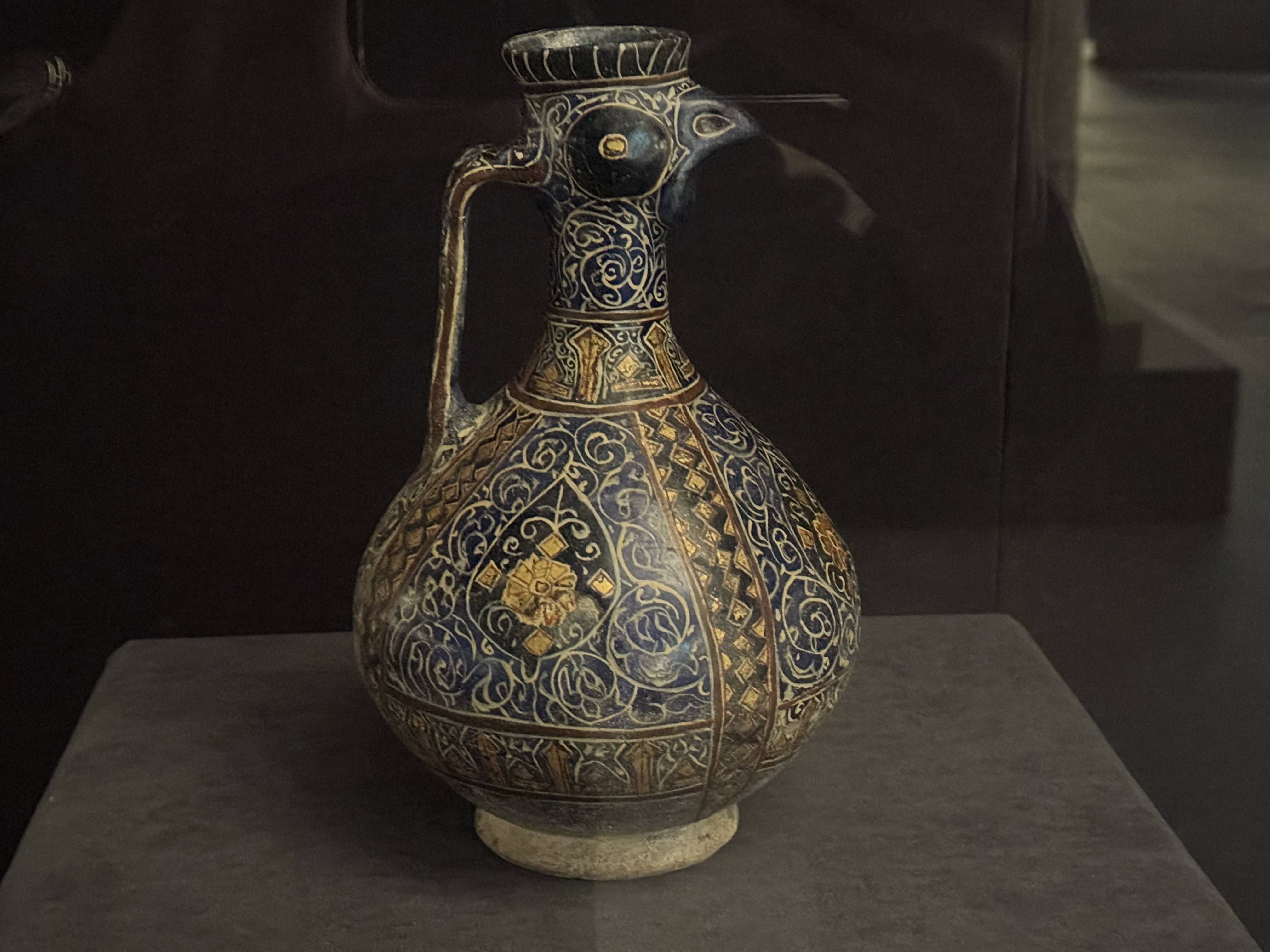 «Данное произведение выполнено в полихромной технике, то есть с использованием нескольких цветов. Этот приём являлся одним из самых передовых достижений гончарного искусства Мавераннахра XIII–XIV веков. Гармония красного, белого и синего цветов придаёт сосуду изящество и выразительность. В то же время эти цвета обладают глубоким символическим значением: белый олицетворяет чистоту и духовную ясность, синий — небесное и божественное начало, красный — жизнь, энергию и динамику. Сочетание формы и цвета превращает сосуд не только в эстетически привлекательный объект, но и в произведение искусства с глубоким духовным содержанием».