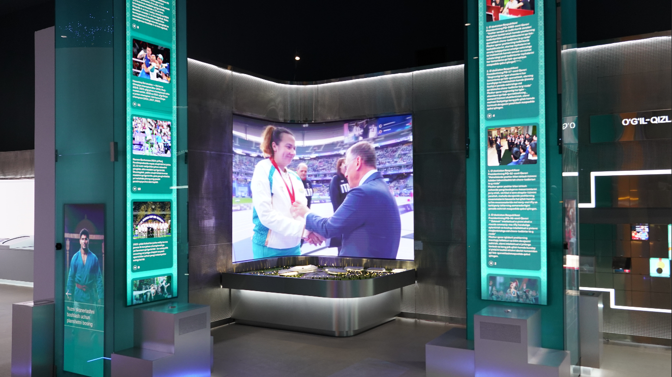 Здесь демонстрируются динамичные видеоматериалы, отражающие достижения молодежи и спортсменов Узбекистана.