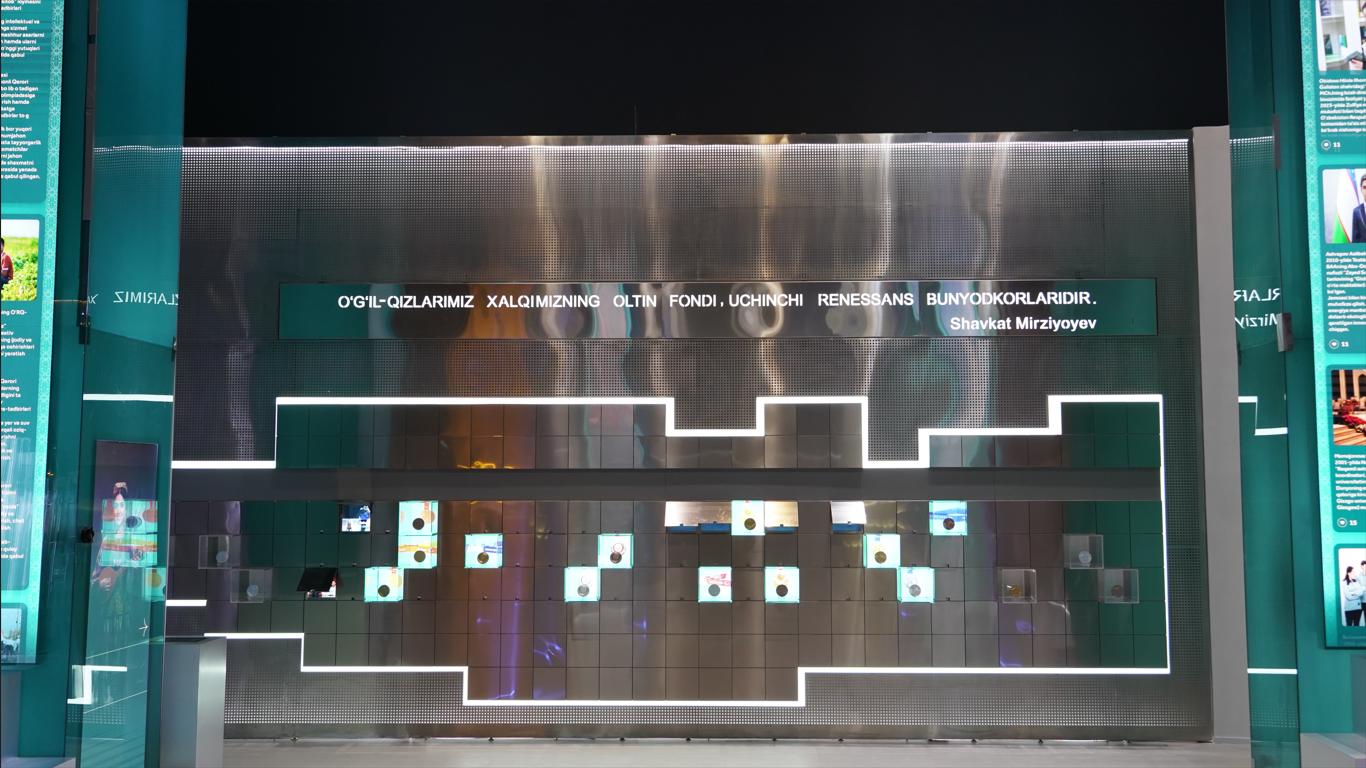 Здесь представлены олимпийские медали, а также активная молодежь Нового Узбекистана. Пустые ячейки в будущем будут постепенно заполняться новыми достижениями.