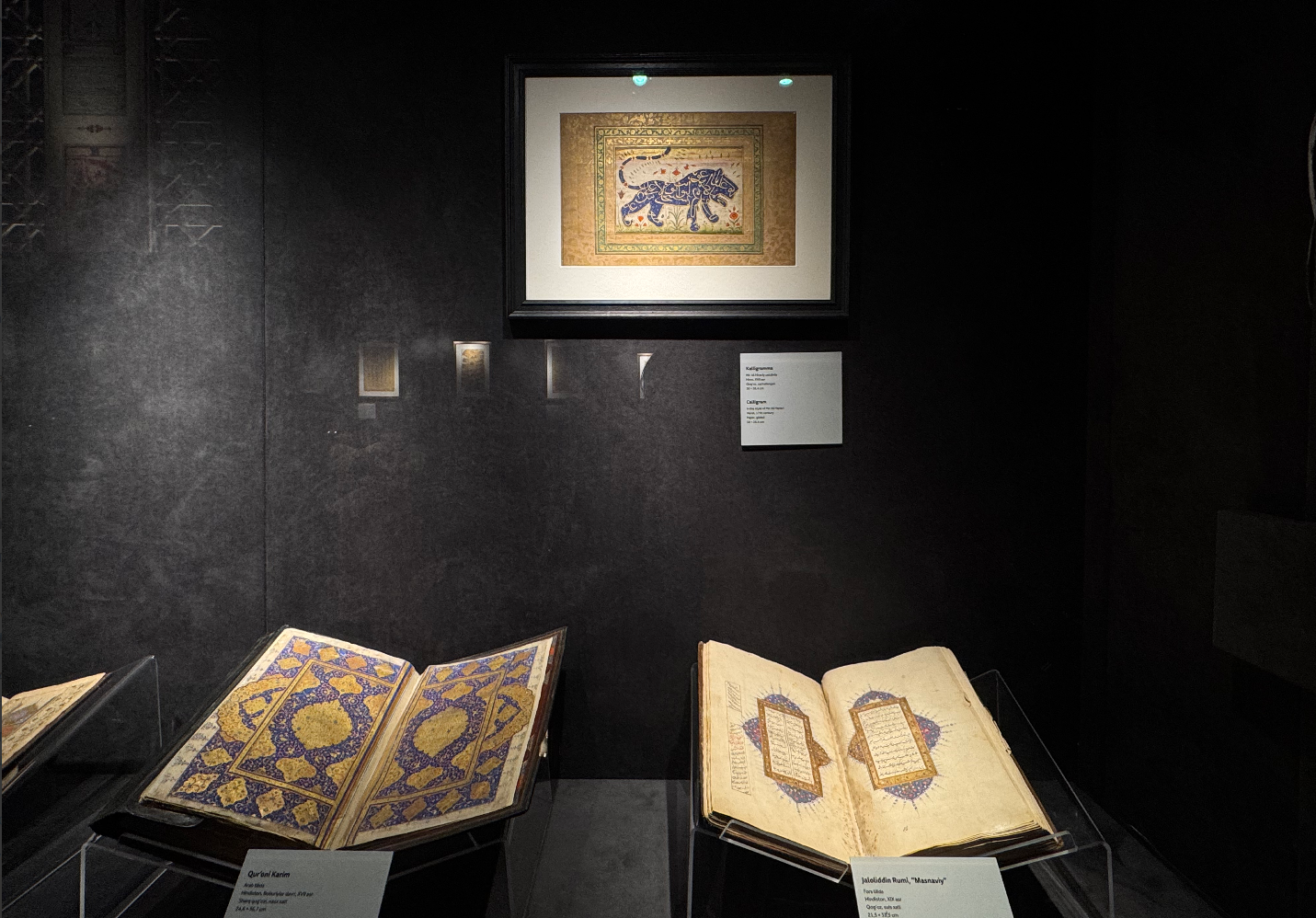 В экспозиции представлена каллиграмма с изображением тигра, шагающего вперёд. Его фигура полностью сформирована из букв и слов арабского письма. Произведение представляет собой сложное художественное решение, основанное на единстве текста и образа. Тело, лапы и хвост животного переданы изогнутыми и вытянутыми линиями письма, а ритмичное расположение букв создаёт ощущение движения и внутренней силы. Более плотная проработка письма в области головы усиливает выразительность и подчёркивает характер образа.