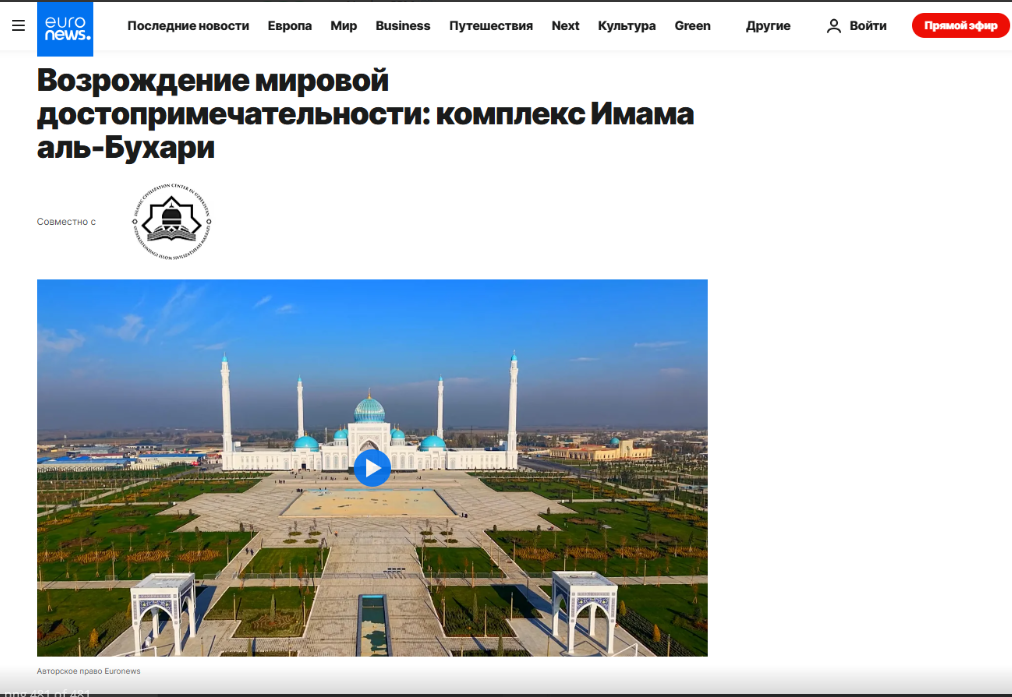 Издание Euronews осветило масштабное возрождение мемориального комплекса Имама аль-Бухари, считающегося одним из самых священных мест мусульманского мира в Узбекистане. В материале подчёркивается многовековое историческое значение этой святыни, расположенной близ Самарканда, глубокое почтение к наследию великого мухаддиса Имама аль-Бухари, а также представлен новый комплекс, в котором традиционная архитектура органично сочетается с современной инфраструктурой. Мемориал показан как духовный и паломнический центр мирового значения.