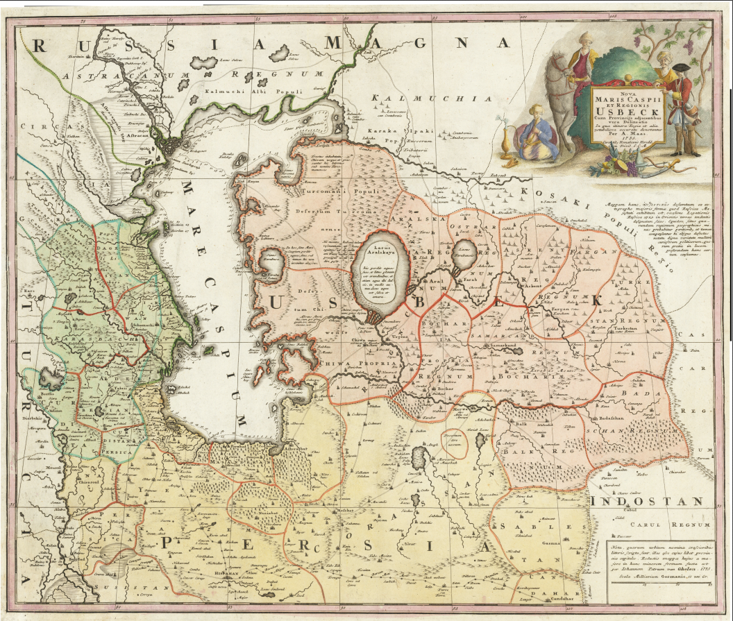 Историческая карта. Каспийское море и Узбекская страна. Абрахам Маас (1641–1729). Нюрнберг, 1735 год. Размер: 48 × 60 см.