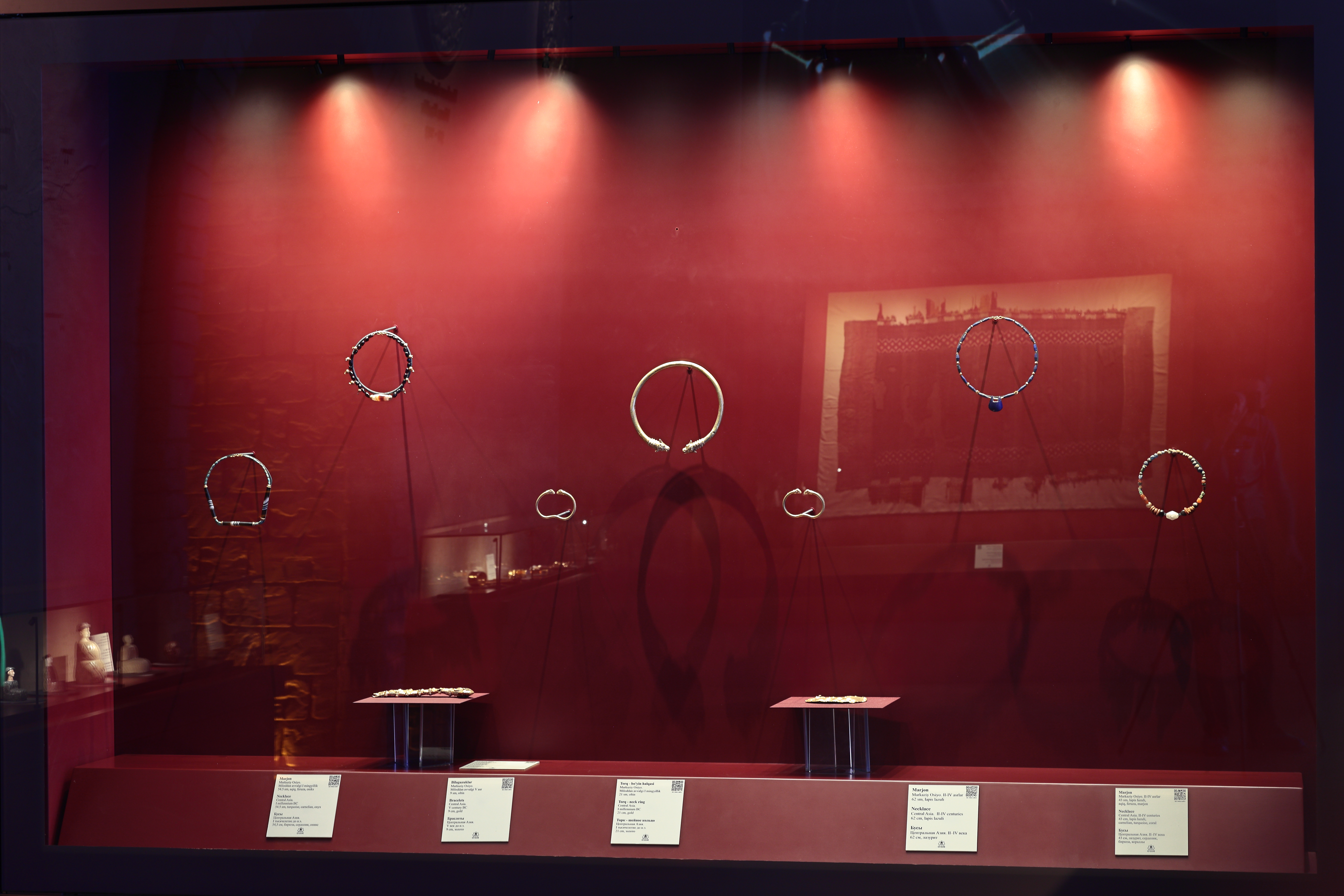 Ekspozitsiyada namoyish etilayotgan oltin bilaguzuklar Baqtriya jamiyatida ijtimoiy maqom va boylikning asosiy belgilaridan biri hisoblangan. Sof oltindan yasalgan ushbu taqinchoqlar aqiq, feruza va lochintosh kabi yarim qimmatbaho toshlar bilan bezatilgan. Ular nafaqat zeb-ziynat buyumi, balki qudrat, hokimiyat va farovonlik ramzi sifatida ham talqin etilgan.
