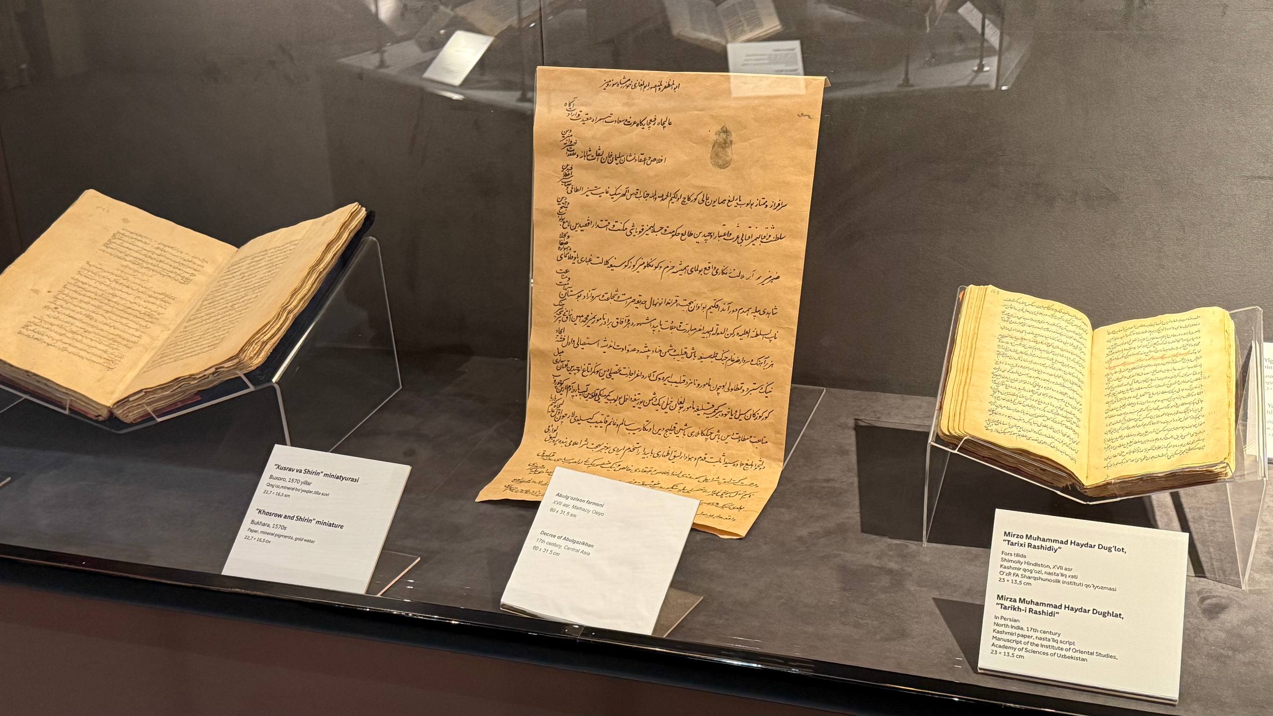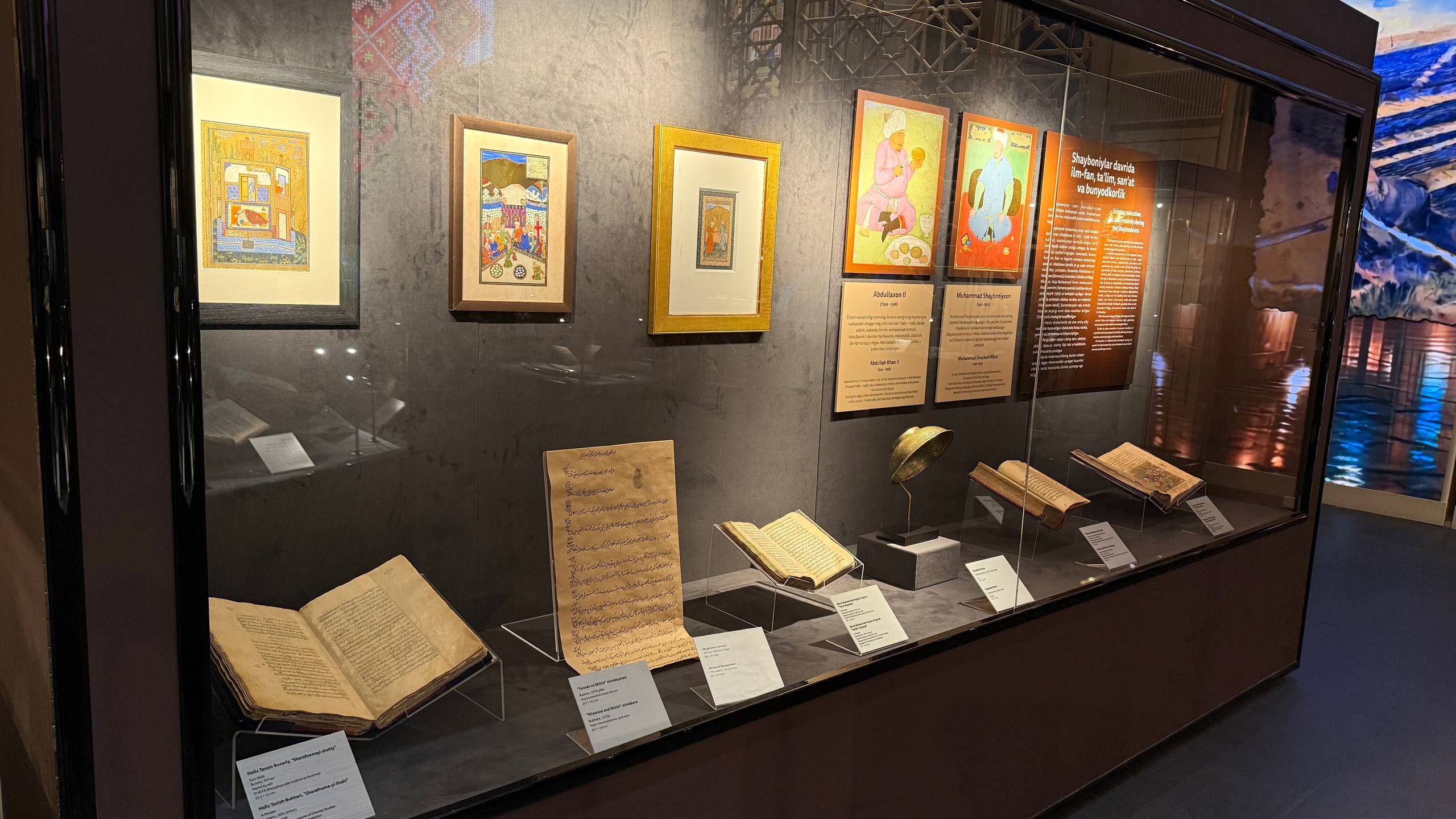 Ayniqsa, Shayboniylar va Ashtarxoniylar davriga oid nodir qoʻlyozmalar, rasmiy hujjatlar, farmonlar alohida eʼtiborni tortadi. Ular orasida buyuk Xiva xoni, tarixchi va mutafakkir Abulgʻozi Bahodirxonga tegishli turkiy tilda yozilgan farmon ekspozitsiyaning eng qimmatli durdonalaridan biri sanaladi.
